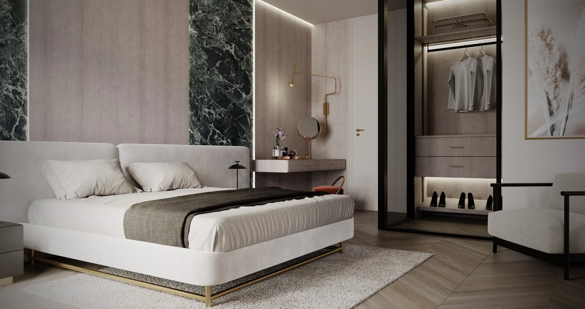 Il linguaggio progettuale unisce materiali pregiati, finiture ricercate e volumi morbidi, creando ambienti sofisticati ma accoglienti.