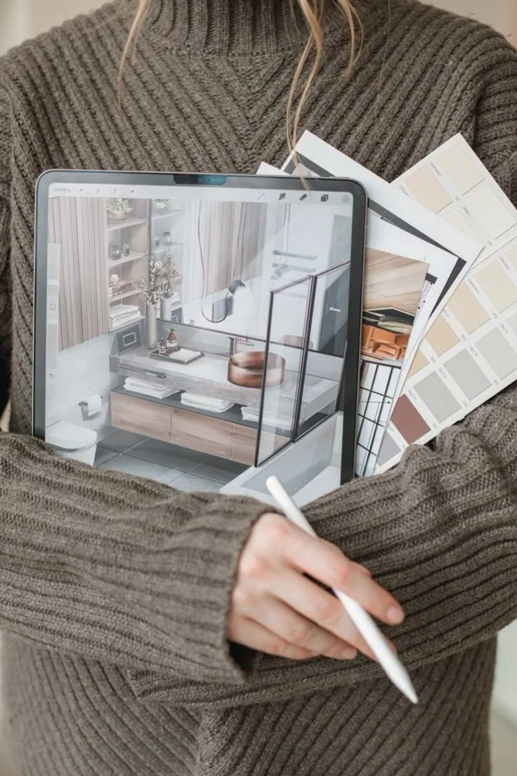 Mi occupo di tutto: consulenza, progetto, scelta materiali, ricerca fornitori, accompagnamento in showroom e, se serve, direzione lavori in loco.
