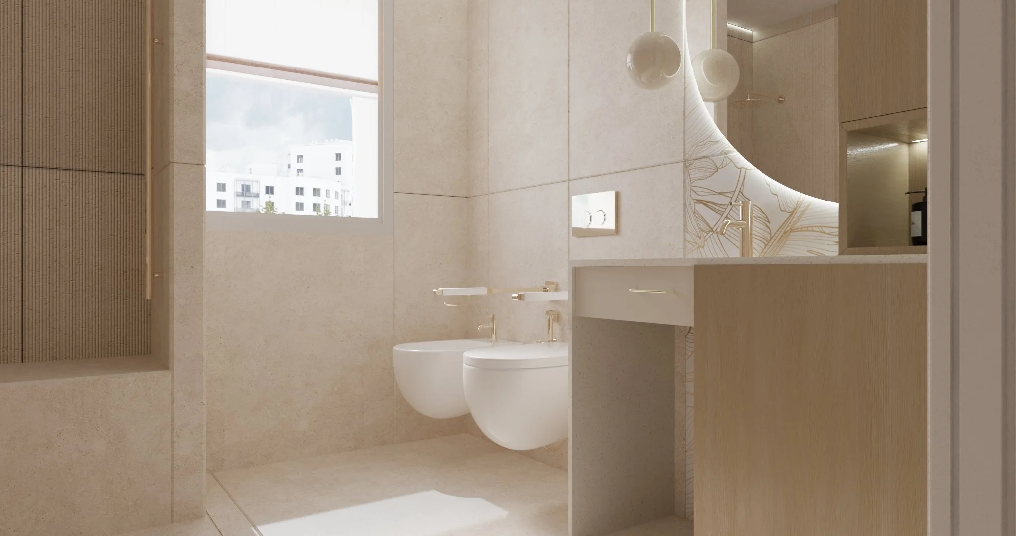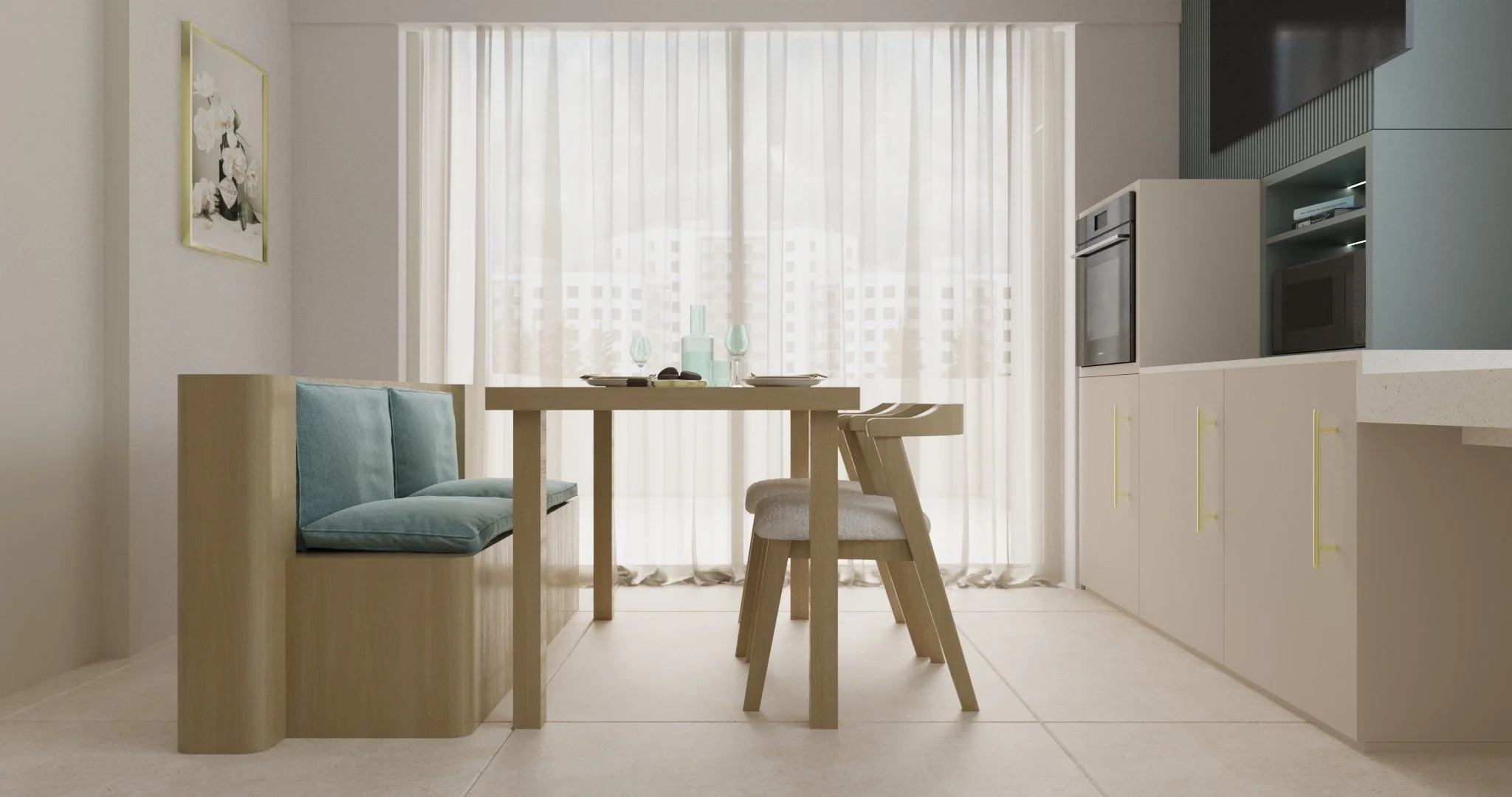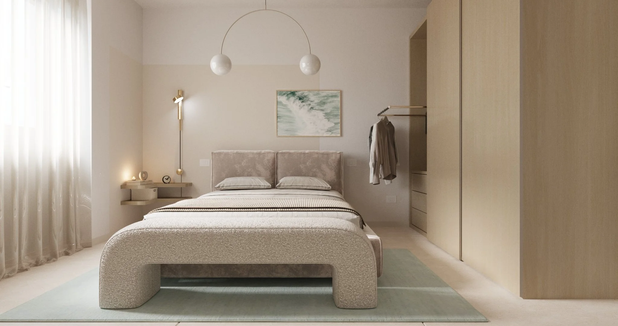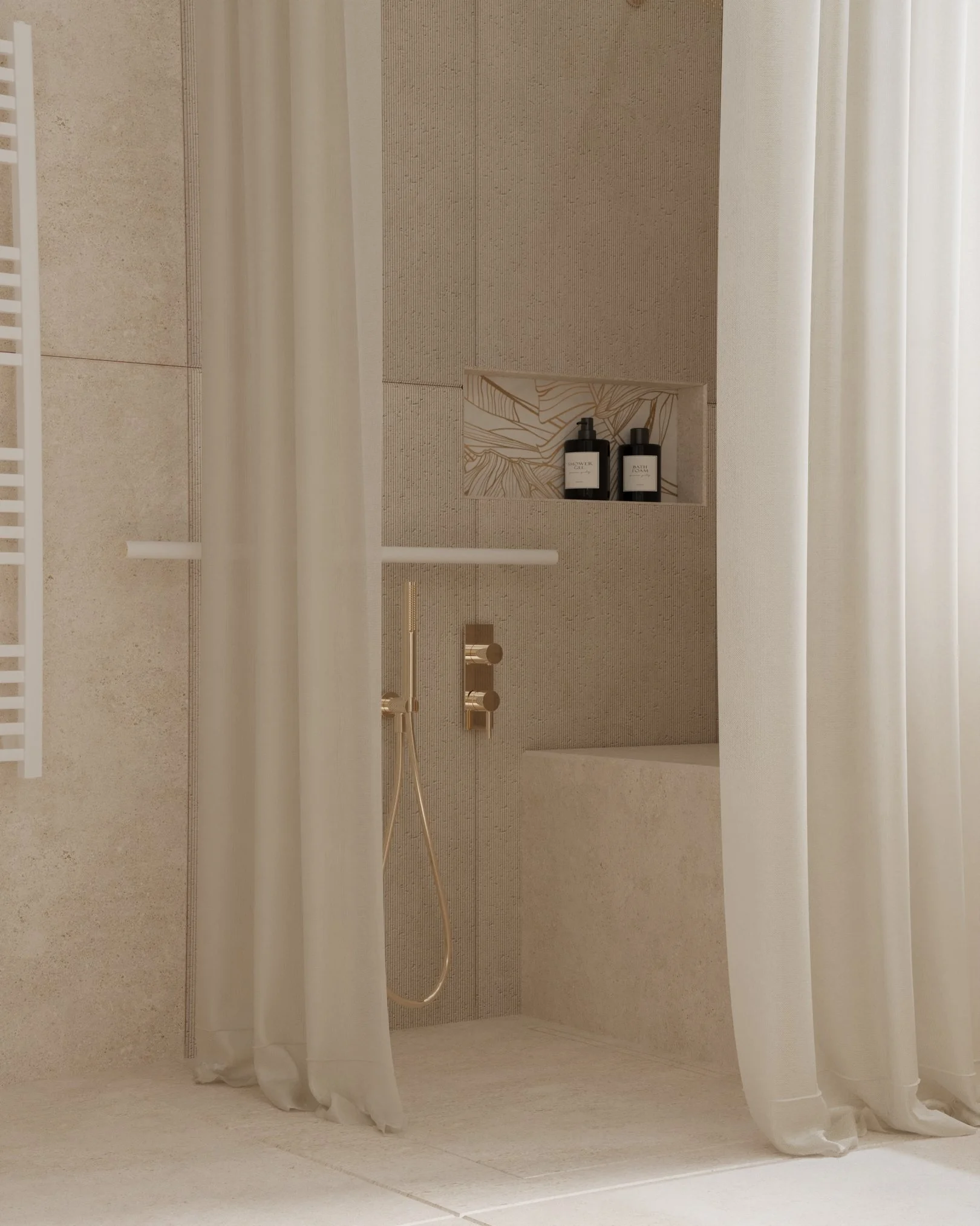La palette cromatica richiama una naturale bellezza pura, i materiali naturali e le linee morbide e essenziali definiscono uno spazio caldo e accogliente. Questa palette nasce dal azzurro carta da zucchero di un arredo per essere integrato in armonia con il resto.