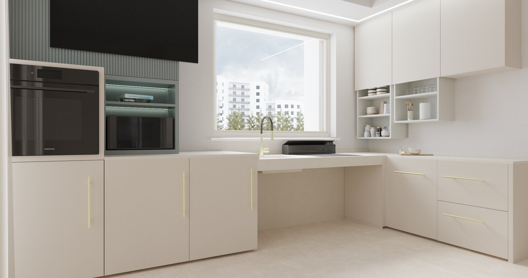 La cucina, come il mobile lavabo, è stata disegnata da zero e poi realizzata da un bravo artigiano. Gli elementi che la caratterizzano sono i pensili motorizzati che scendono altezza piano, frigo e freezer sotto piano e il vuoto sotto i fornelli e il lavabo così da poter accogliere una sedia di supporto.